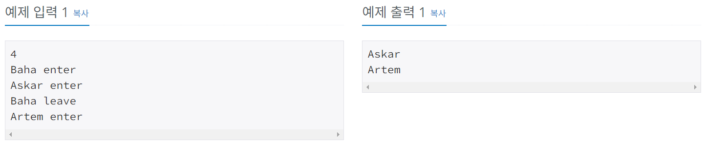 위 예제 입력을 받는 형식과 enter, leave에 따라 set에 add()와 remove()를 하는 코드를 짜면 다음과 같다.