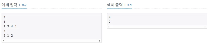 입력의 첫 번째 줄에는 입력 데이터의 수를 나타내는 정수 T가 주어진다. 각 테스트 데이터는 두 줄로 구성되어 있다.