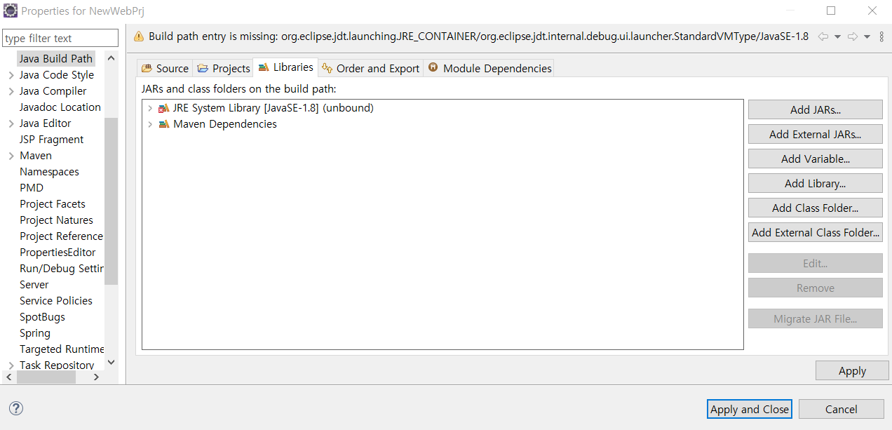 unbound가 있는 Java library도 없다면 Add Library > JRE System Library로 추가한다.