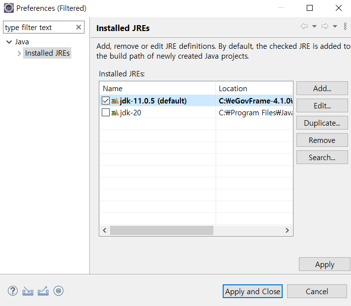 JDK 11을 default로 설정하고 Apply and Close하면 JDK 11의 Library를 추가할 수 있게 된다.