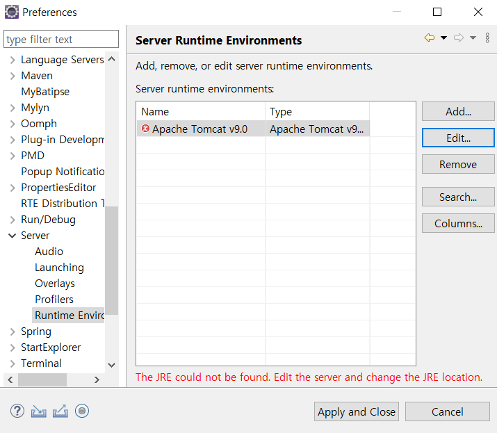 해결 방법은 Window > Preferences에서 Server > Running Enviroments에 들어간 뒤
