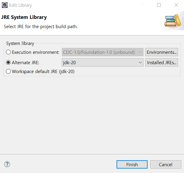 이 포스트를 작성하면서 원래 Java SE-1.8로 잘 되던걸 JDK 20로 억지로 꼬아서 에러를 재현하다가 원래대로 바꿔도 'The JRE could not be found'가 계속 뜨길래 본의 아니게 Troubleshooting을 하게 되었다...