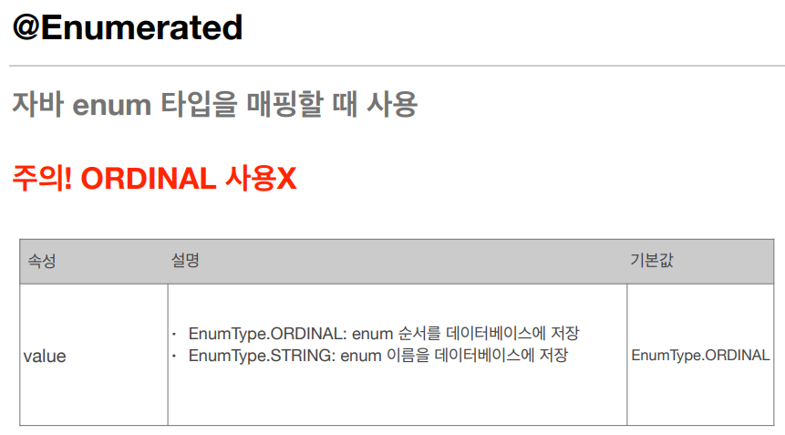 // 객체에는 enum 타입을 쓰고 싶음, but DB에는 enum 타입이 없음 -> @Enumerated 사용
