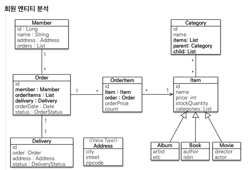 ✅ 참고: 회원 엔티티 분석 그림에서 Order와 Delivery가 단방향 관계로 잘못 그려져 있다. 양방향 관계가 맞다.