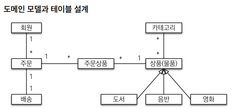 카테고리와 상품: @ManyToMany 를 사용해서 매핑한다.(실무에서 @ManyToMany는 사용하지 말자. 여기서는 다대다 관계를 예제로 보여주기 위해 추가했을 뿐이다)