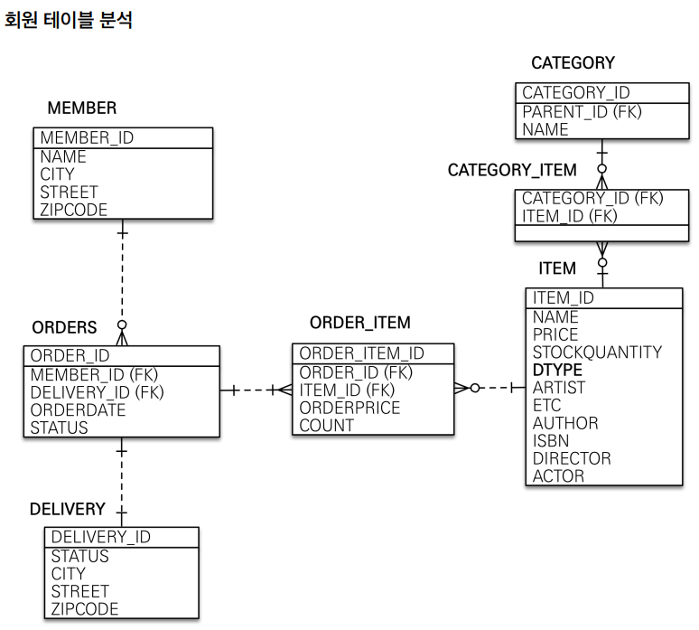 MEMBER: 회원 엔티티의 Address 임베디드 타입 정보가 회원 테이블에 그대로 들어갔다. 이것은 DELIVERY 테이블도 마찬가지다.