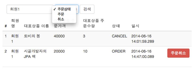 화면에 보면 회원명과 주문 상태로 검색을 할 수 있다. 여기서 필터링 조건인 회원명이 들어가야 주문, 취소 상태를 만들 수 있다. 결국 동적 쿼리가 만들어져야 하는 상황이다.