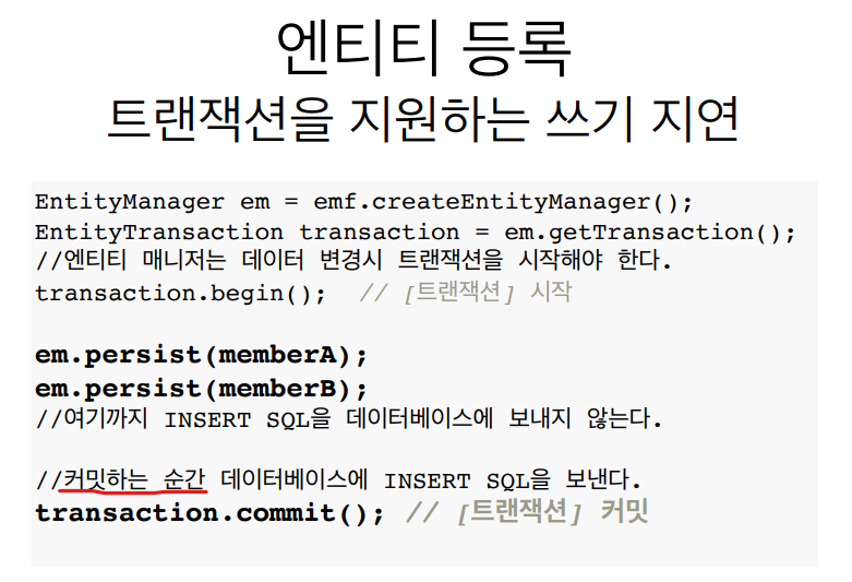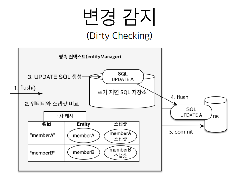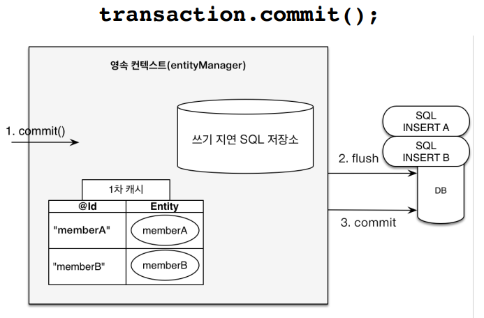 - 쓰기 지연 SQL 저장소의 쿼리를 데이터베이스에 전송 (등록, 수정, 삭제 쿼리)