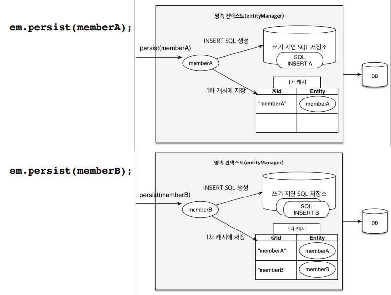 persist 메서드는 DB에 저장하는 것이 아니라 영속성 컨텍스트에 저장한다는 뜻이다.