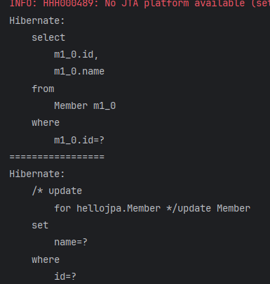 마치 Java Collection을 다루듯이 name만 바꿨는데 업데이트 쿼리가 나간 것을 볼 수 있다.