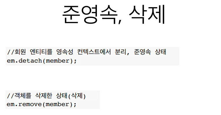 - 영속 상태의 엔티티가 영속성 컨텍스트에서 분리(detached)