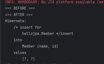 출력 결과를 보면 Before와 After사이에 아무것도 없고 After 이후에 insert된 것을 볼 수 있다. persist를 한다고 해서 DB에 저장된 것이 아니라 DB 이후에 커밋해야 저장된다.