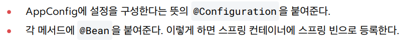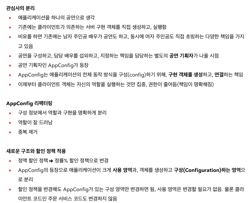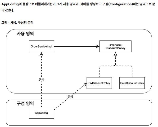 AppConfig란? 애플리케이션의 전체 동작 방식을 구성하기 위해, 구현 객체를 생성하고, 연결하는 책임을 가진 별도의 클래스이다.