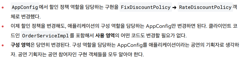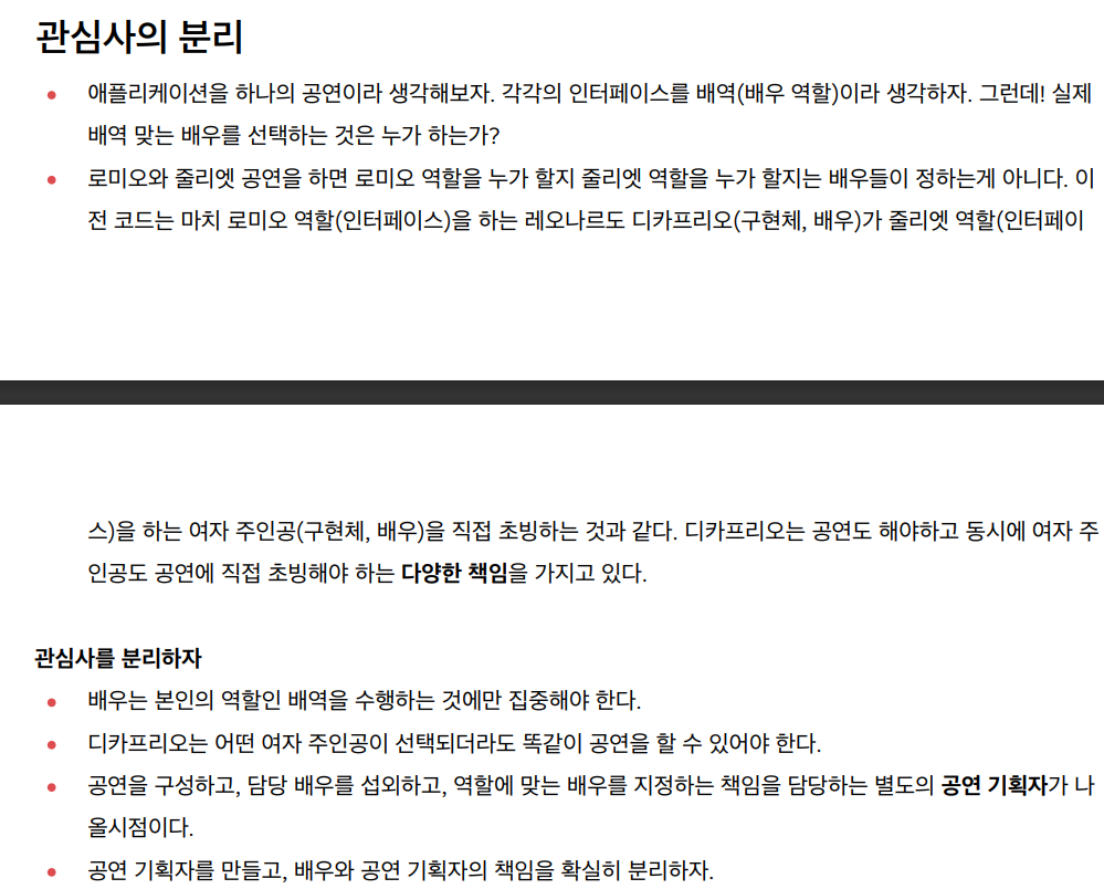 구현체가 절대로 다른 구현체는 선택하는 일은 없어야 하고 어떤 구현체를 선택할지는 별도의 클라이언트가 정하는 것이다. 예를 들어 역할극의 배우가 절대로 다른 배우를 선택하는 책임을 가져서는 안되고 배우는 자신의 역할(인터페이스)에만 집중을 하고 그에 맞는 배우를 선택하는 것은 공연 기획자가 해야할 일이다.