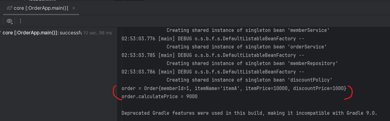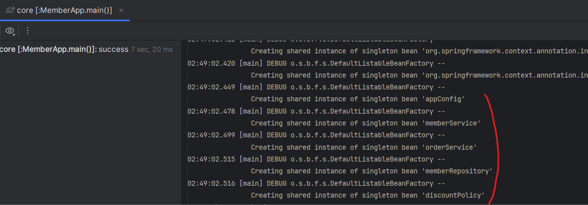 두 코드를 실행하면 스프링 관련 로그가 몇줄 실행되면서 기존과 동일한 결과가 출력된다.