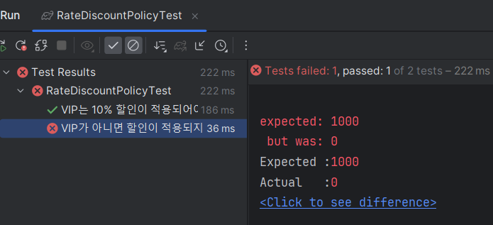 // assertThat(discount).isEqualTo(1000);로 실행해버리면 discount의 기대했던 값은 1000원인데 실제값은 0원이다. 회원은 VIP가 아니고 BASIC이기 때문이다. 따라서 assertThat(discount).isEqualTo(0);으로 고쳐야 한다.