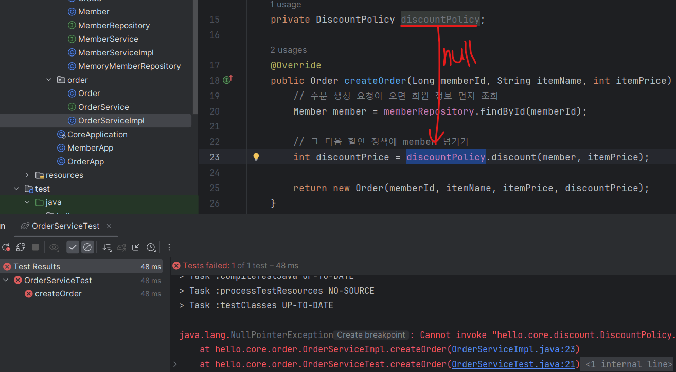 discountPolicy에 값이 없기 때문에 NullPointerException 에러가 발생한다.