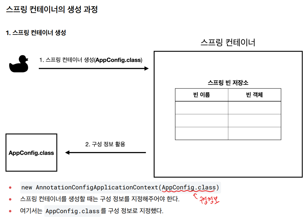 1번 과정: 스프링 컨테이너 안에 AppConfig의 정보를 넣는 순간 컨테이너가 생성이 된다. 컨테이너는 구성 정보를 AppConfig로 부터 받는다.