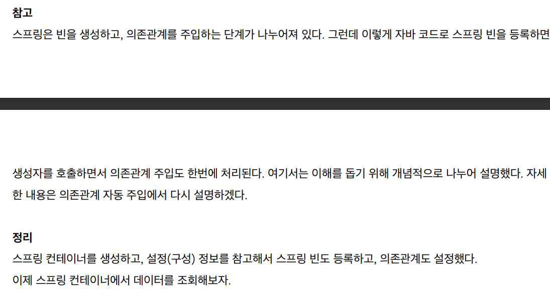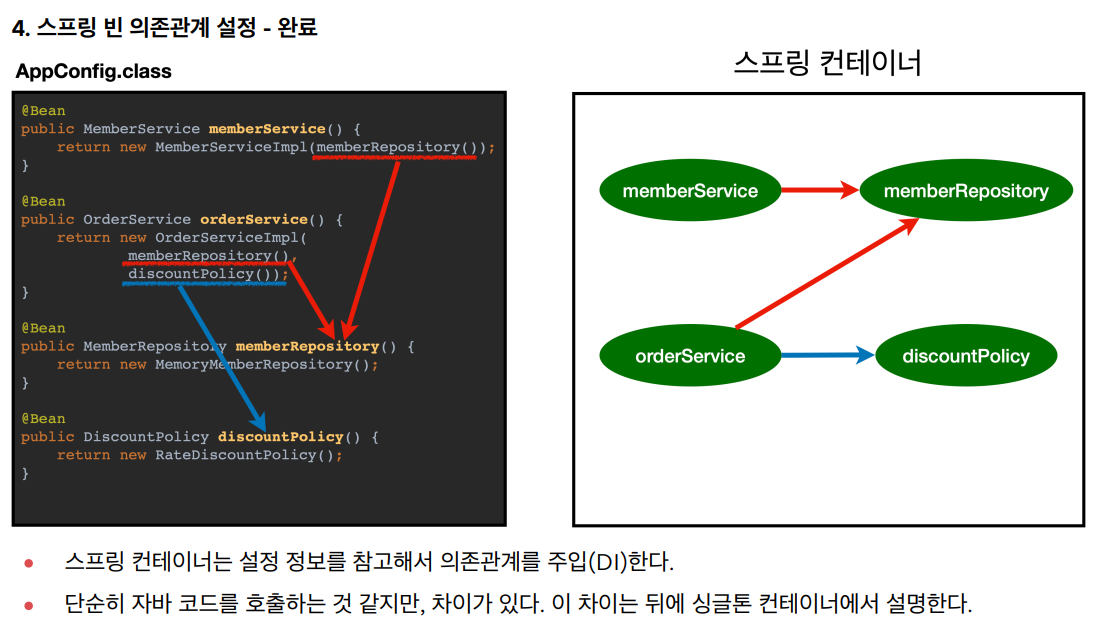 4번 과정: 스프링 컨테이너안에 있는 객체들은 서로의 클래스에 의존하는 관계를 유지하고 있고 컨테이너는 이러한 의존관계를 주입 시켜준다. 즉, 동적인 객체 인스턴스 의존관계를 스프링이 연결해준다.