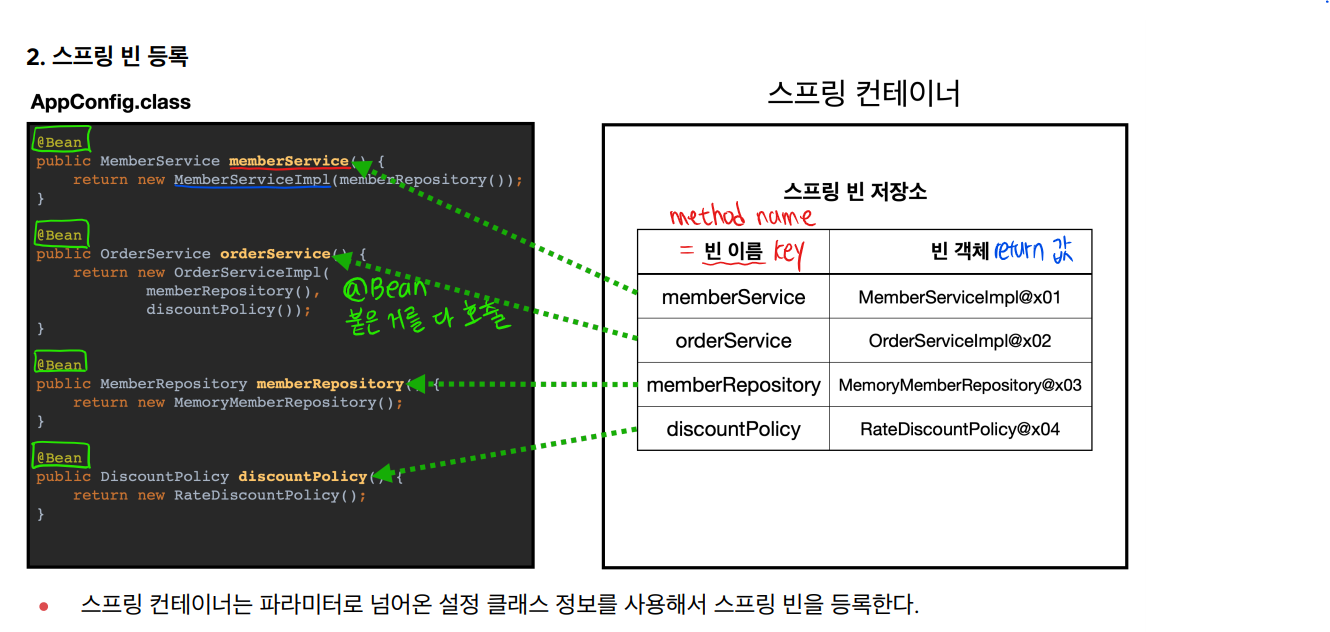 2번 과정: AppConfig.class안에 있는 정보를 통해서 @Bean이 적힌 클래스 정보가 스프링 빈 저장소에 등록된다. key인 빈 이름은 method name, 빈 객체는 return 하는 값이 저장된다.