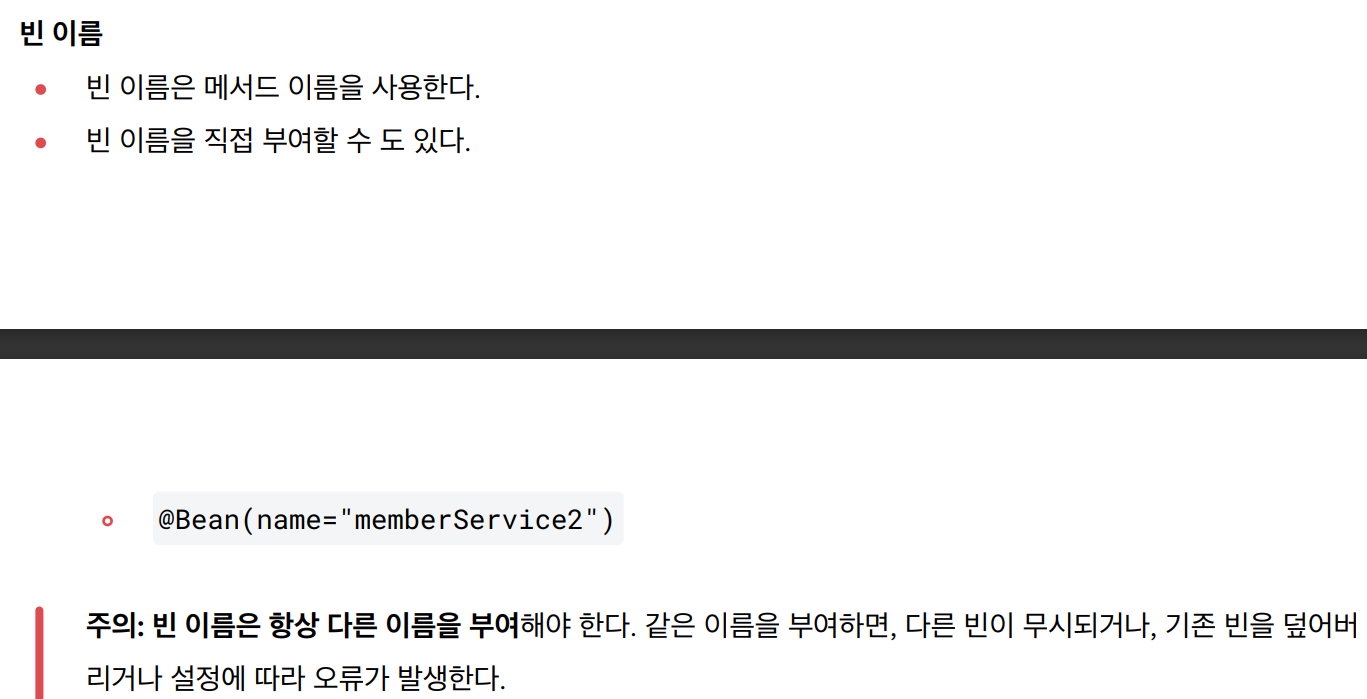 📢 주의: 빈 이름은 항상 다른 이름을 부여해야 한다. 같은 이름을 부여하면, 다른 빈이 무시되거나, 기존 빈을 덮어버리거나 설정에 따라 오류가 발생한다.