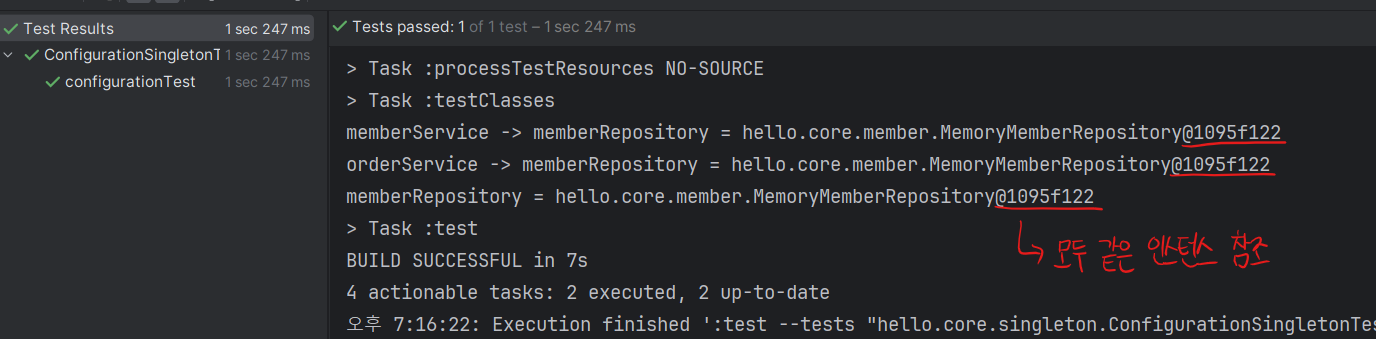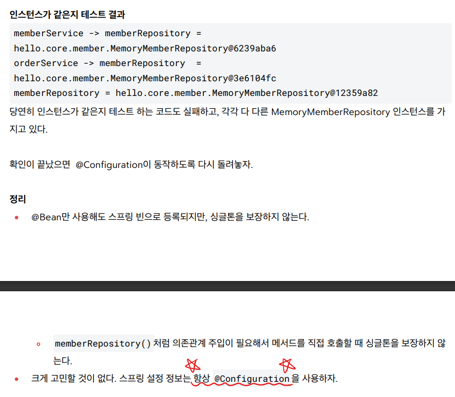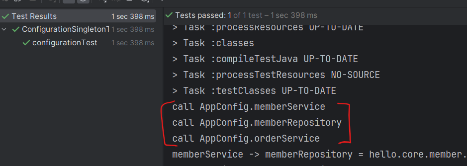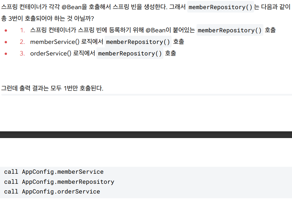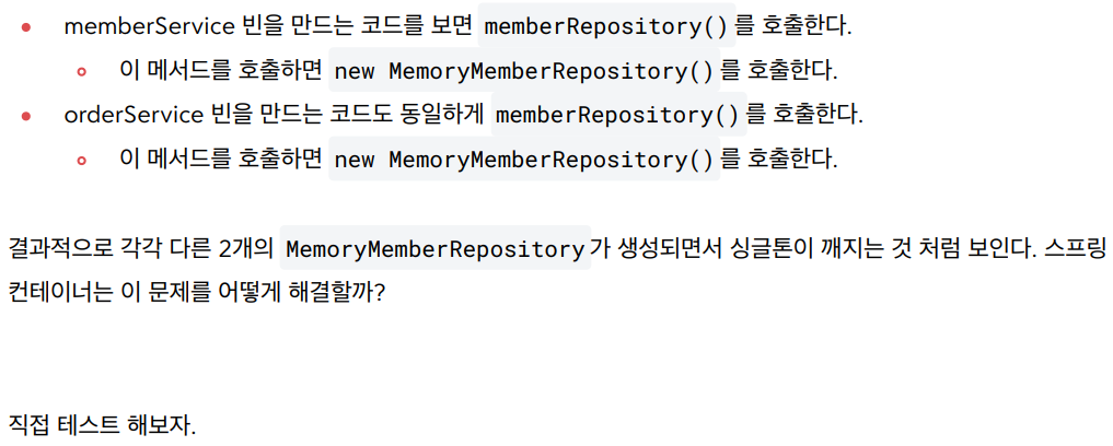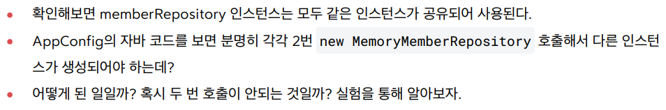 // new MemoryMemberRepository() 두 번 호출!! -> 싱글톤 깨지는 거 아니야 ???