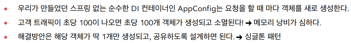 웹 애플리케이션은 기본적으로 많은 고객이 동시에 요청을 한다. 그러나 위에 있는 그림처럼 요청이 들어올때마다 새로운 객체를 만들게 되면 메모리 낭비가 너무 심하므로, 1개를 생성하고 공유하도록 설계 하도록 만들어진게 싱글톤 패턴이다.