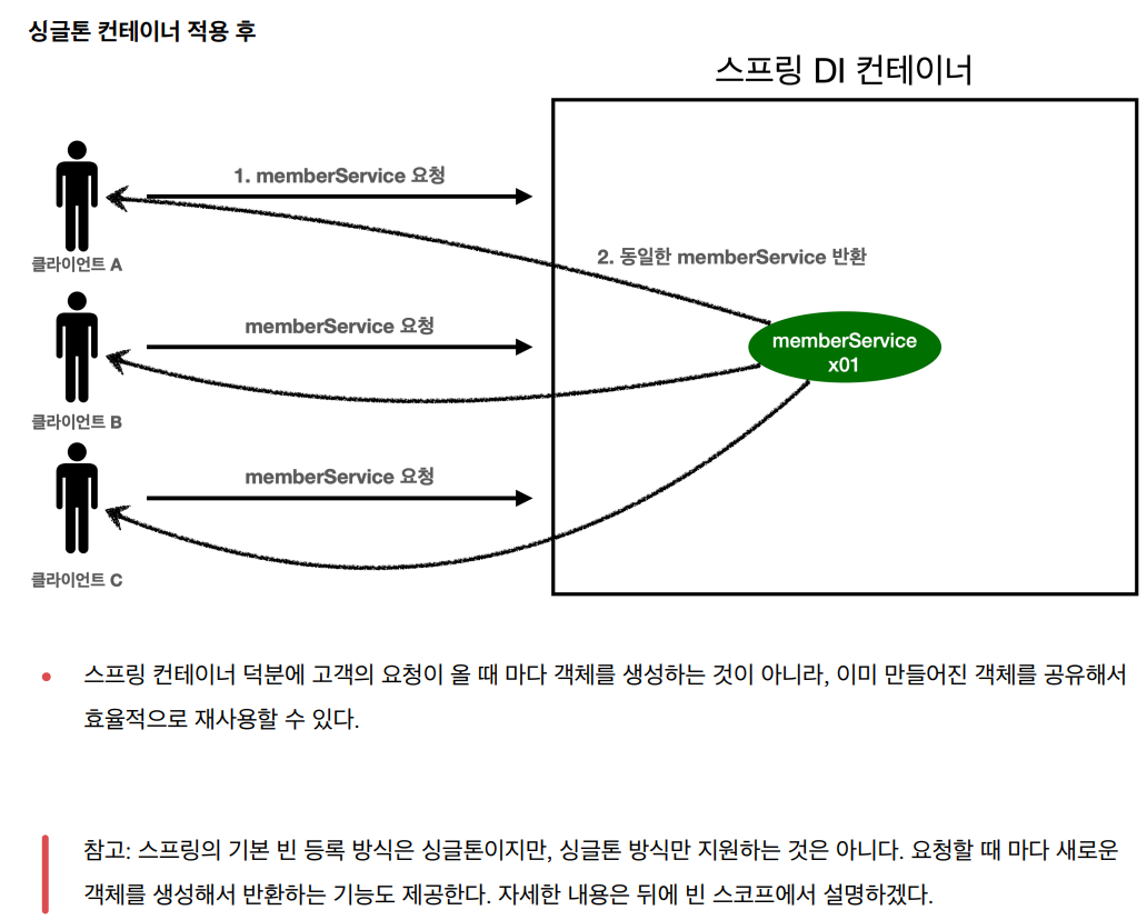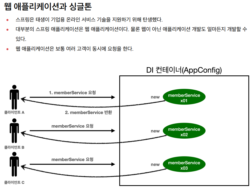 memberService1, memberService2가 jvm 메모리에 계속 다른 객체가 생성돼서 올라간다. 이렇게 되면 고객이 많은 웹 애플리케이션에 효율적이지 않다.