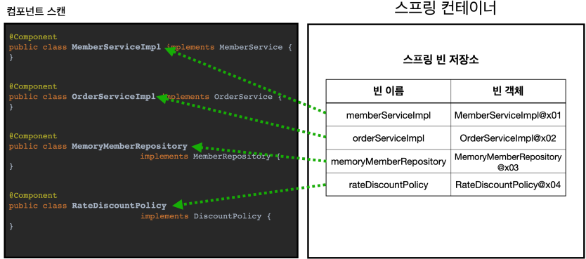 컴포넌트 스캔과 자동 의존관계 주입이 어떻게 동작하는지 그림으로 알아보자.