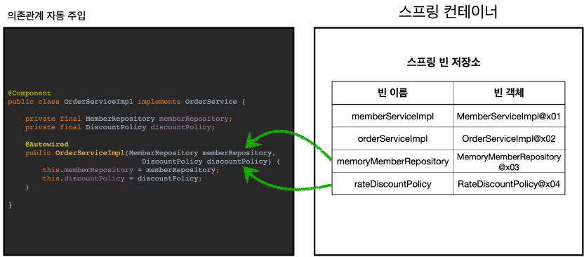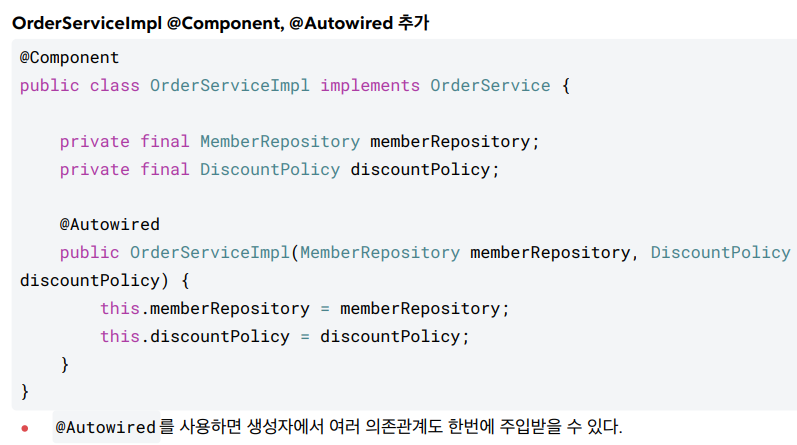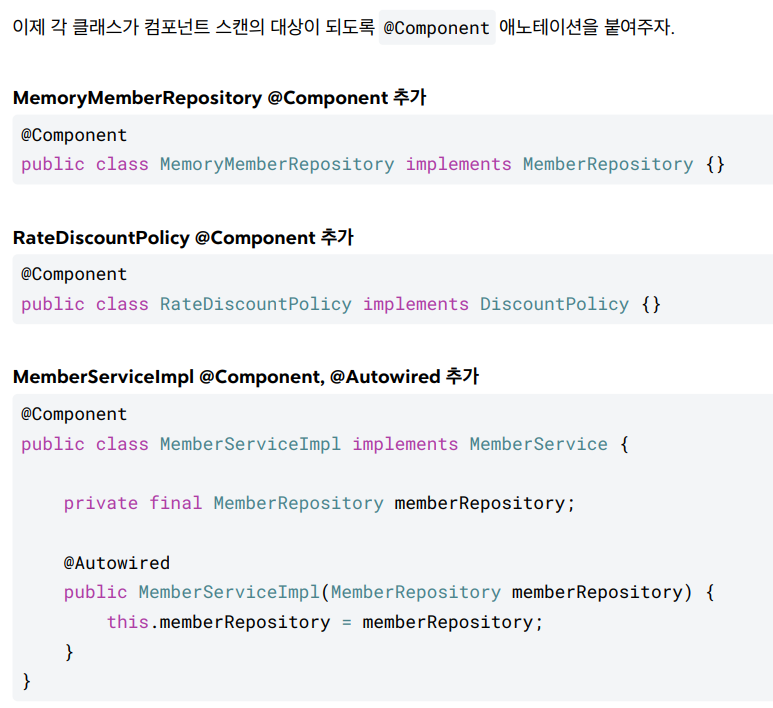 @Bean 으로 직접 설정 정보를 작성했고, 의존관계도 직접 명시했다. 이제는 이런 설정 정보 자체가 없기 때문에, 의존관계 주입도 이 클래스 안에서 해결해야 한다. @Autowired 는 의존관계를 자동으로 주입해준다. 자세한 룰은 조금 뒤에 설명하겠다.