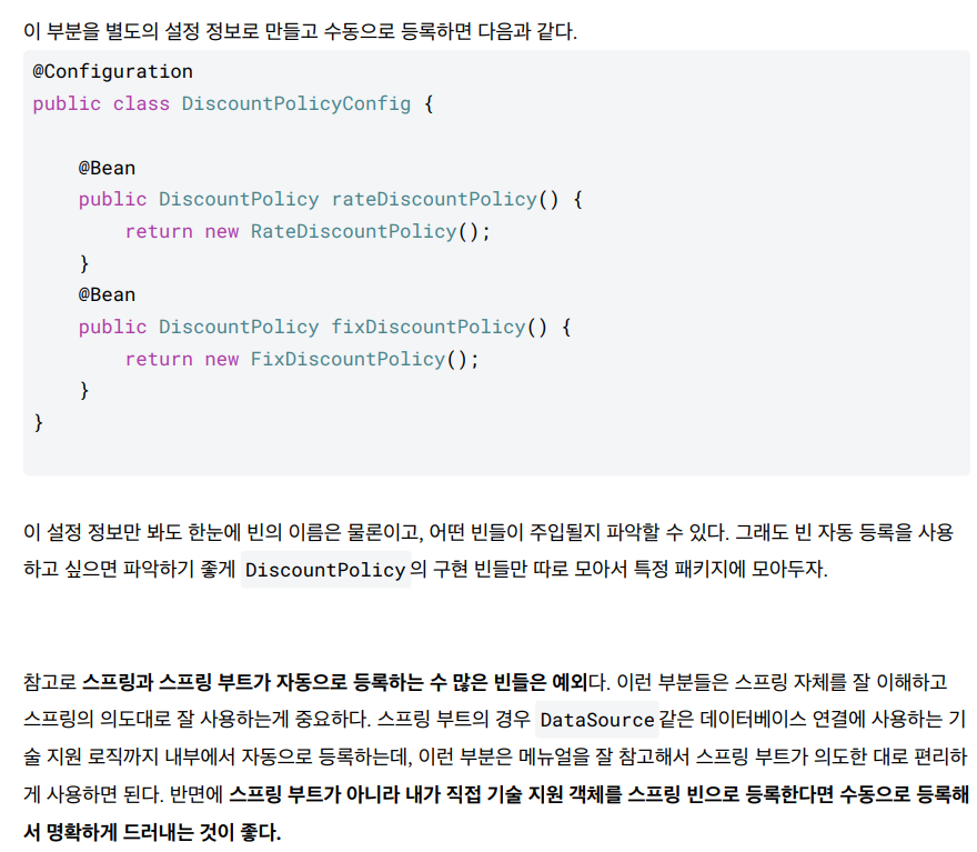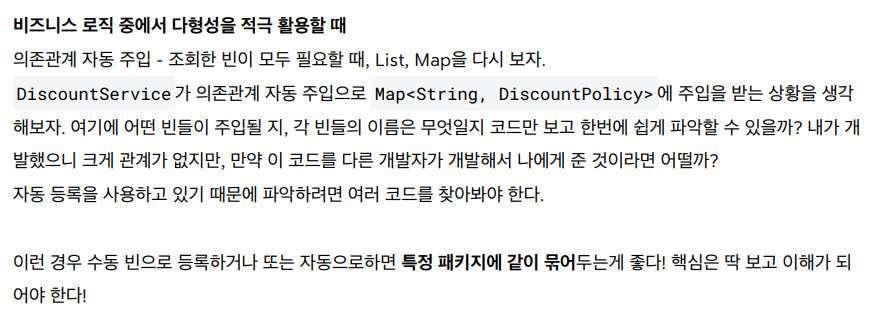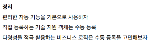 스프링 빈을 수동 등록해서 문제를 해결해도 되지만, 의존 관계 자동 주입에서 해결하는 여러 방법이 있다.
