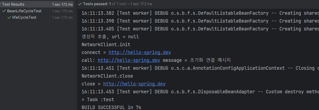 ✅ 참고: 싱글톤 빈들은 스프링 컨테이너가 종료될 때 싱글톤 빈들도 함께 종료되기 때문에 스프링 컨테이너가 종료되기 직전에 소멸전 콜백이 일어난다. 뒤에서 설명하겠지만 싱글톤처럼 컨테이너의 시작과 종료까지 생존하는 빈도 있지만, 생명주기가 짧은 빈들도 있는데 이 빈들은 컨테이너와 무관하게 해당 빈이 종료되기 직전에 소멸전 콜백이 일어난다. 자세한 내용은