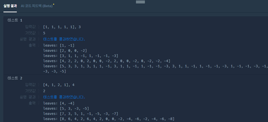 입력된 numbers 배열의 각 숫자에 대해 반복합니다. 각 숫자에 대해, 현재 leaves 리스트에 있는 각 값에서 해당 숫자를 더하거나 빼는 두 가지 새로운 값을 만듭니다. 이 두 값은 자손 노드로 간주됩니다. temp 리스트에 이 두 가지 경우를 모두 추가합니다.
