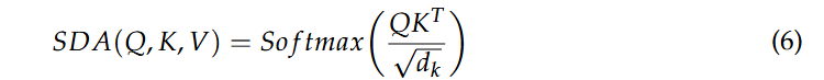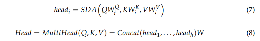 이를 이용한 아이디어로 서로 다른 파라미터 를 사용하여 행렬 Q, K, V 에 선형 변환을 수행하고, 그 결과를 SDA에 입력한다. 헤드 i부터 h까지의 결과들을 하나의 행렬로 연결하고 파라미터 W를 곱하여 최종 선형 변환을 완료하여 식(8)에 나타난 멀티 헤드 어텐션 메커니즘의 최종 출력을 얻는다.