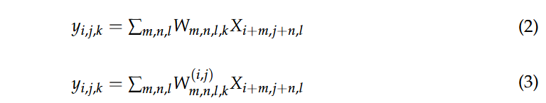 수식 (2)는 global 가중치 공유 식이며, (3)은 local 가중치 공유 식이다. 여기서 는 좌표 (i, j)에서의 지역 가중치 행렬 내 가중치를 나타낸다. 논문 저자들은 데이터 간의 상관관계를 분석하여 상관관계가 강한 다차원 데이터에 대해 먼저 동일한 지역 가중치 행렬을 사용한다고 한다.