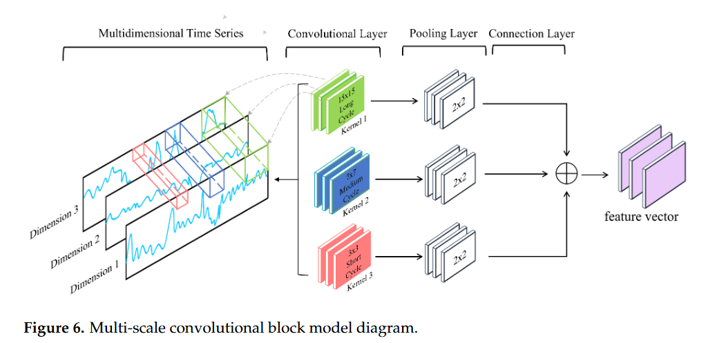 고정된 Conv 커널이 특정 스케일의 특징만 포착할 수 있다는 문제를 해결하기 위해 데이터셋에서 다양한 시간 스케일의 고도로 표현력 있는 잠재 특징을 추출하기 위한 다중 스케일 Conv 커널을 이 논문에선 추가로 제안한다. 여기선 세 개의 병렬 경롤르 가진 Conv 레이어를 구성하며, 각 경로는 서로 다른 커널 크기를 가지고, 각 Conv 레이어는 다중 Conv 방법을 사용한다.