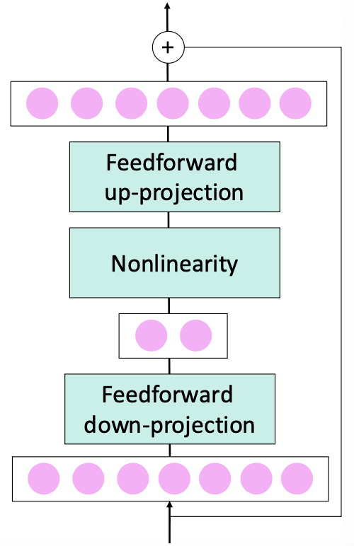 Feedforward down-projection: 먼저 입력 차원 를 작은 차원 로 줄인다.