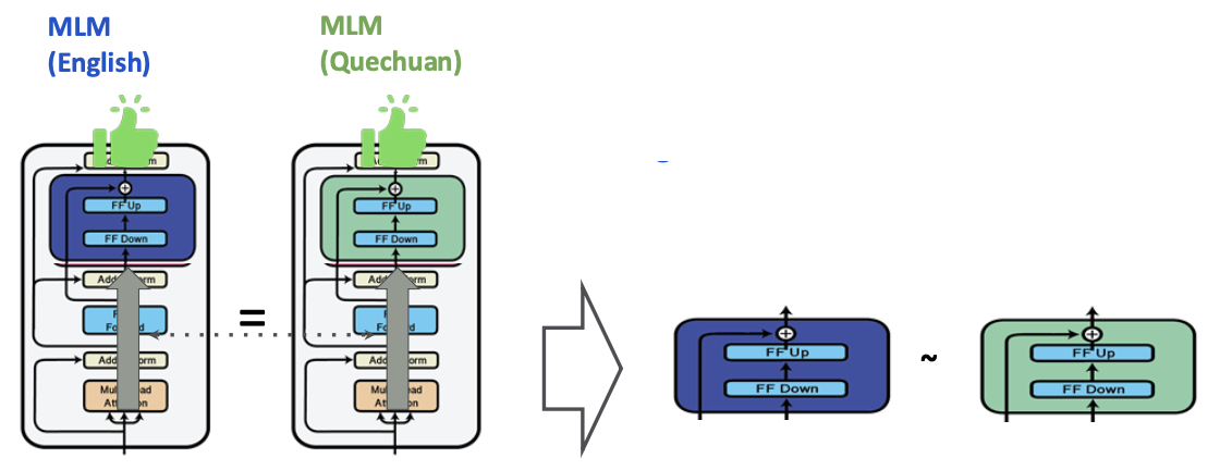 Masked language modeling(MLM)을 이용하여 언어에 특화된 변화(예를 들어 영어에서 케추아어로)를 학습할 수 있다.