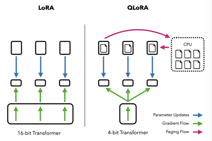 QLoRA는 LoRA의 장점을 그대로 가지면서 사전 학습 모델을 4-bit precision으로 양자화하여 메모리 부담을 줄인다.