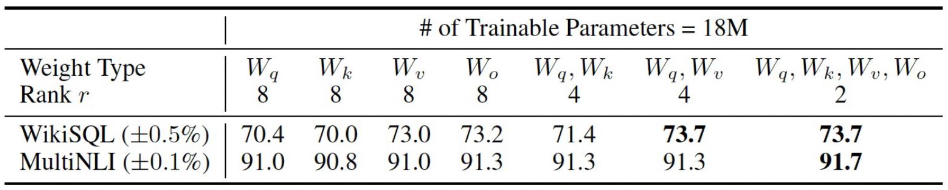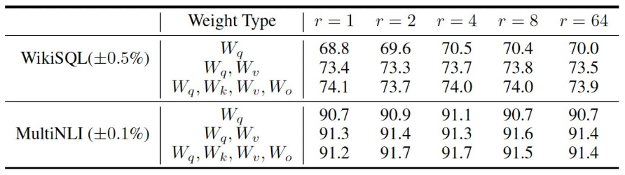 위 표를 살펴보면 에 대해 rank가 일 때, 즉 query, key, value, output 모두에 인 LoRA를 적용했을 때 각 벤치마크에 대해 성능이 73.7, 91.7로 가장 높은 것을 확인할 수 있다.