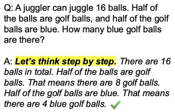 태스크와 함께 "Let's think step by step." 같은 추론 유도 문구를 넣어주면 모델이 중간 추론과 함께 최종 답을 생성하는 방식이다.