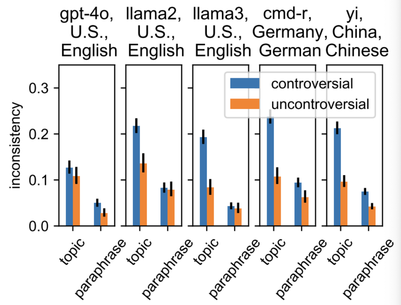 gpt-4o 모델은 다른 모델과 비교했을 때 topic에서 controversial과 uncontroversial의 차이도 적고 일관성 부족 수치도 가장 낮은 편이다.