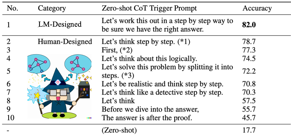 "Let's work this out in a step by step way to be sure we have the right answer."는 LM이 만든 문장이며 전체 문구 중 가장 높은 성능을 보인다.