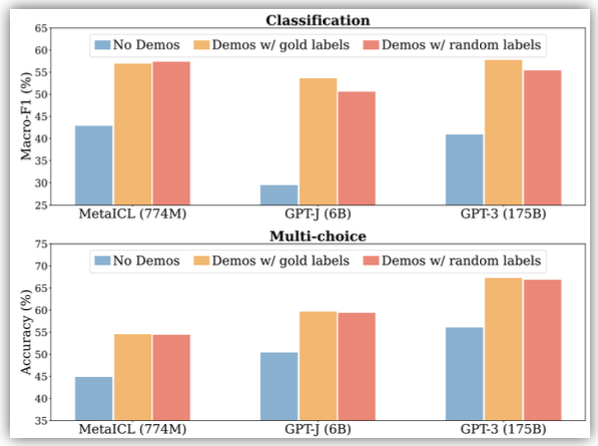 No Demos는 프롬프트에 예시없이 단순히 질문만 있는 경우, Demos w/ gold labels는 프롬프트에 정답이 포함된 예시가 존재하는 경우, Demos w/ random labels는 프롬프트에 존재하는 예시에 틀린 레이블도 존재하는 경우이다.