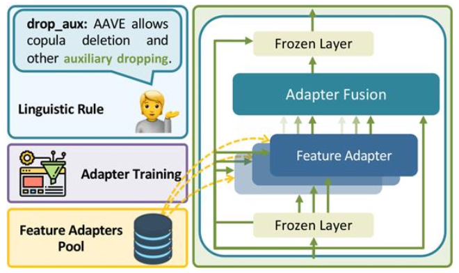 표준 미국 영어로 학습된 사전 학습 언어 모델에 방언을 학습한 adapter를 연결하면 된다.