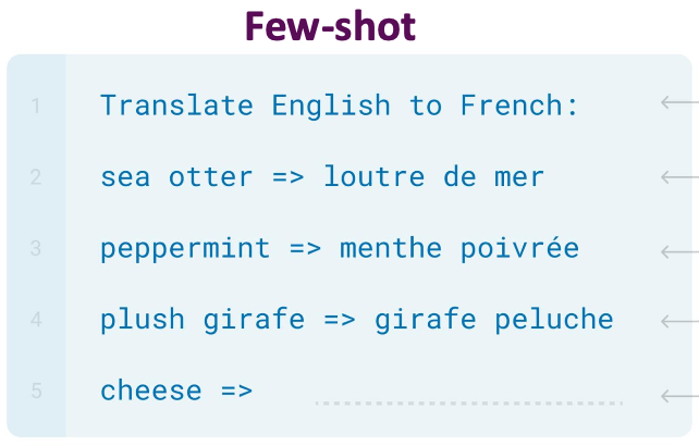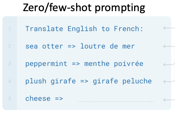 반면 few-shot learning은 파라미터 업데이트하여 학습하는 것이 아닌 모델이 프롬프트의 태스크 지시와 예시를 보고 배운다.