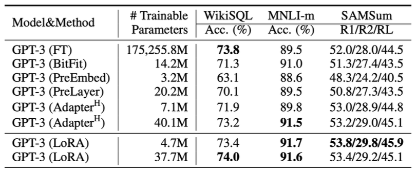 LoRA는 WikiSQL, MNLI-m, SAMSum 등 세 가지 데이터셋 모두에서 파인튜닝 성능이 가장 높다.