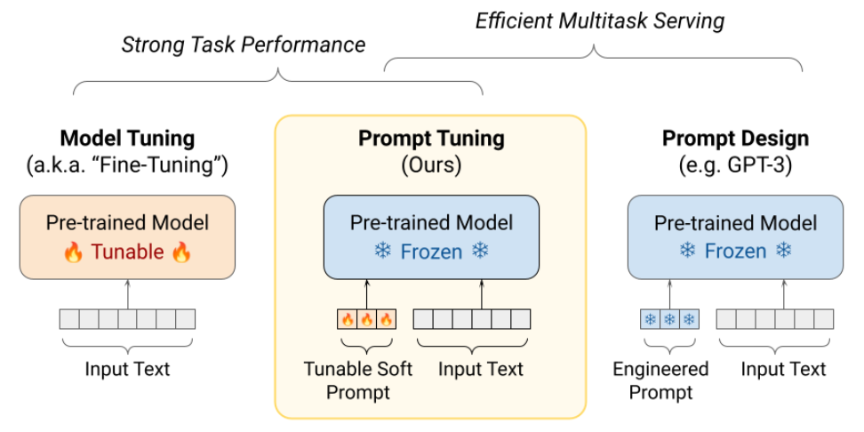 Prompt tuning은 사전 학습 파라미터는 고정하고 virtual tokens를 입력에 붙이는 방식으로 튜닝 시 이 virtual token embeddings만 학습된다.