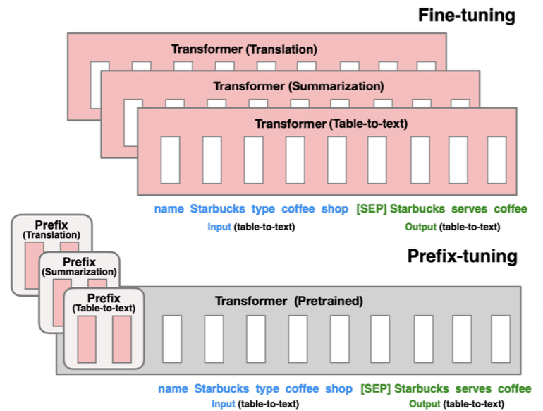 위 그림처럼 모델의 본체, 즉 사전 학습 파라미터는 고정하고 prefix 파라미터만 바꿔 끼우면 이 파라미터에 맞게 태스크 적응이 되는 것이 prefix-tuning의 장점이다.