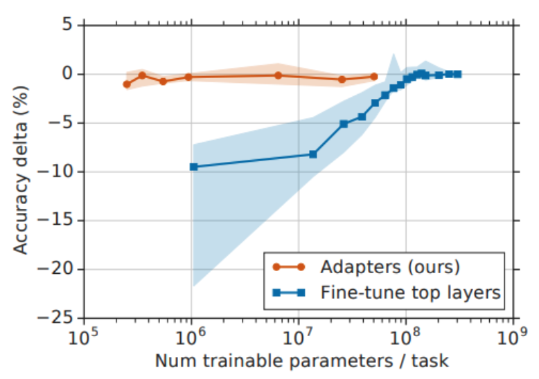 이렇게 adapter를 사용하면 학습해야 하는 파라미터 수가 수준으로 줄어든다.